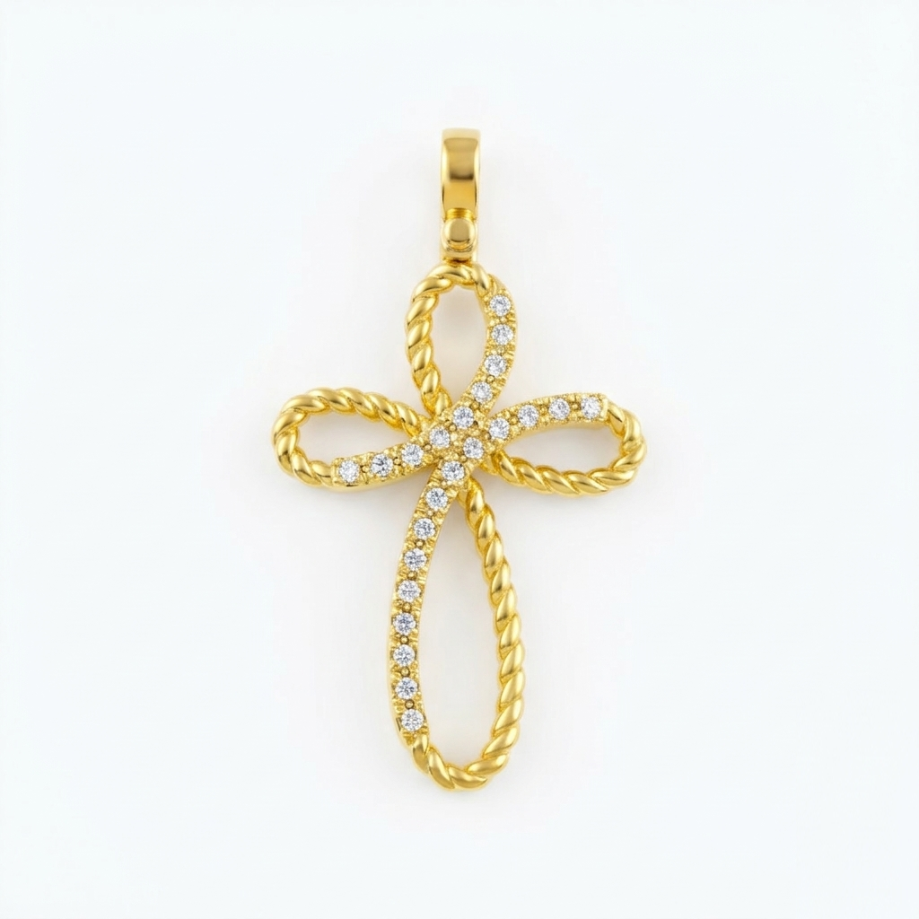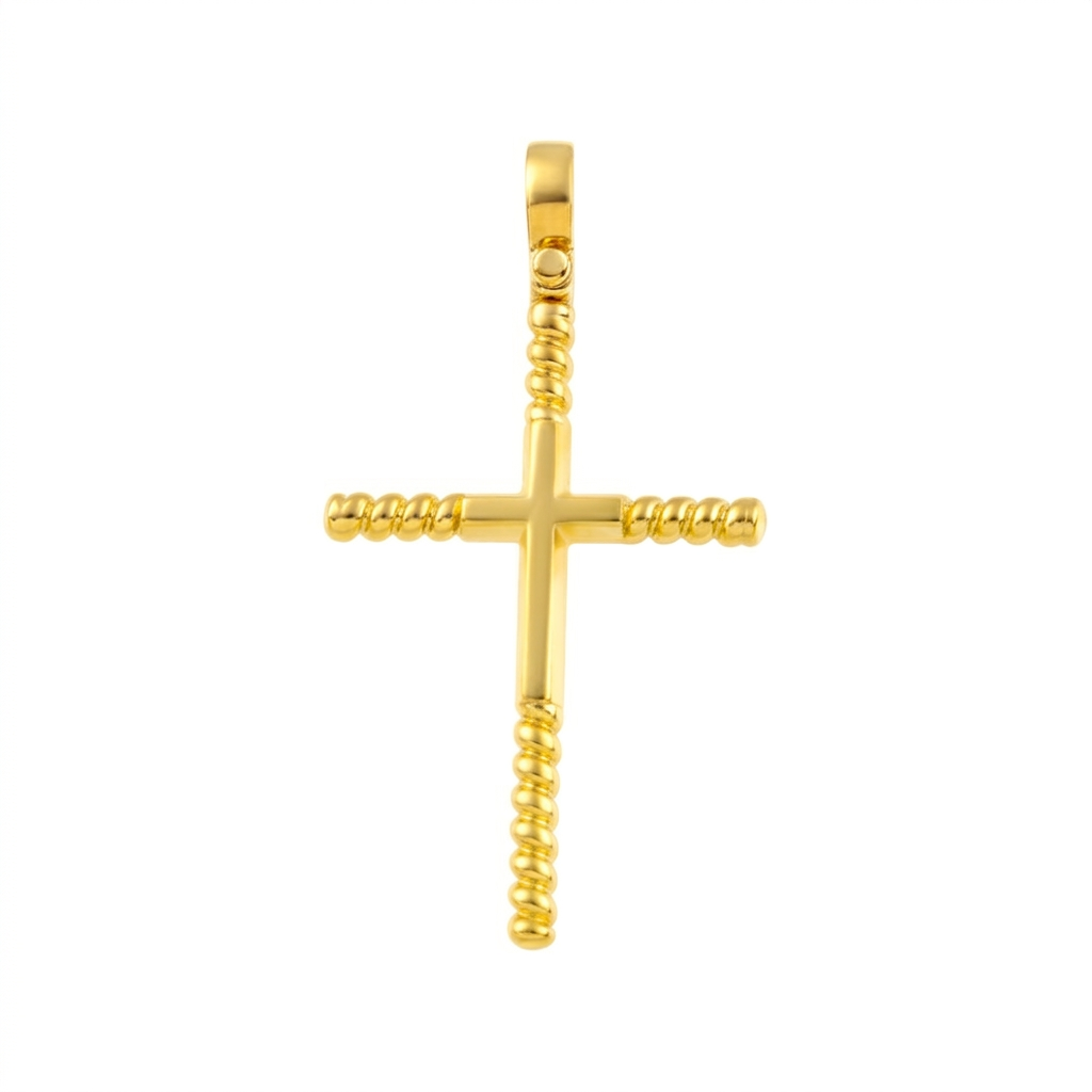 Ένα κόσμημα που υμνεί την κίνηση και την καλλιτεχνική ροή. Ο συγκεκριμένος σταυρός ξεχωρίζει για τον μοναδικό “τρισδιάστατο” σχεδιασμό του, όπου ένα λείο χρυσό σύρμα ελίσσεται με χάρη γύρω από έναν κεντρικό άξονα με στριφτή πλέξη σχοινιού. Η αλληλεπίδραση των δύο διαφορετικών υφών δημιουργεί ένα δυναμικό οπτικό αποτέλεσμα που προσδίδει βάθος