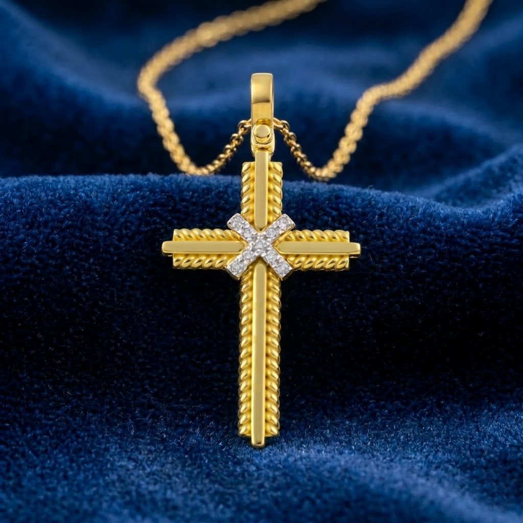 Ένα κόσμημα που αποπνέει δύναμη και καλλιτεχνική λεπτομέρεια. Ο συγκεκριμένος σταυρός ξεχωρίζει για τον πολυεπίπεδο σχεδιασμό του, συνδυάζοντας την απόλυτα λεία, λουστρέ επιφάνεια του κεντρικού σταυρού με ένα περίτεχνο πλαίσιο απο στριφτό σύρμα που προσδίδει βάθος και έντονο χαρακτήρα. Στο κέντρο, ένας διακριτικό “Χ” από λευκά ζιργκόν δημιουργεί μια φωτεινή αντίθεση, ενισχύοντας τη στιβαρή του παρουσία. Αποτελεί μια εξαιρετική επιλογή για βάπτιση ή για όσους αναζητούν ένα διαχρονικό κομμάτι με παραδοσιακές αναφορές και σύγχρονη αισθητική υπεροχή.