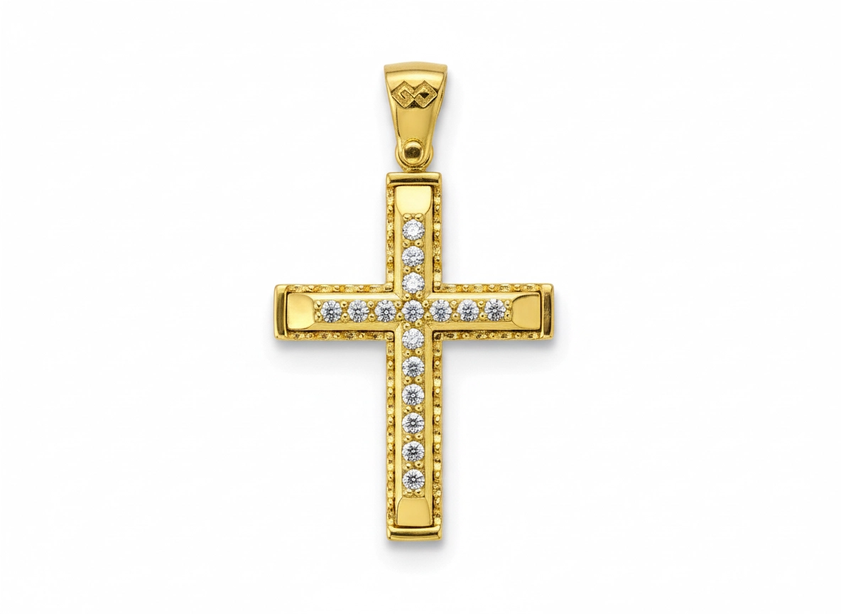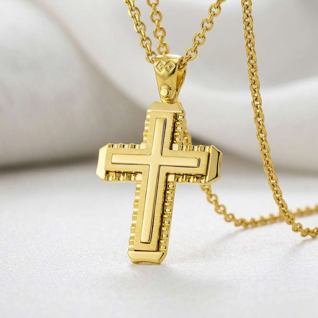 Ένα κόσμημα με επιβλητική παρουσία και καθαρές γραμμές. Ο συγκεκριμένος σταυρός ξεχωρίζει για τον πολυεπίπεδο σχεδιασμό του, συνδυάζοντας την απόλυτα λεία επιφάνεια του κεντρικού σταυρού με ένα περίτεχνο, ανάγλυφο “σκαλιστό” πλαίσιο που προσδίδει βάθος και έντονο χαρακτήρα. Η στιβαρή του κατασκευή τον καθιστά μια εξαιρετική επιλογή για βάπτιση ή για όσους αναζητούν ένα διαχρονικό κομμάτι με παραδοσιακή αξία και σύγχρονη αισθητική.