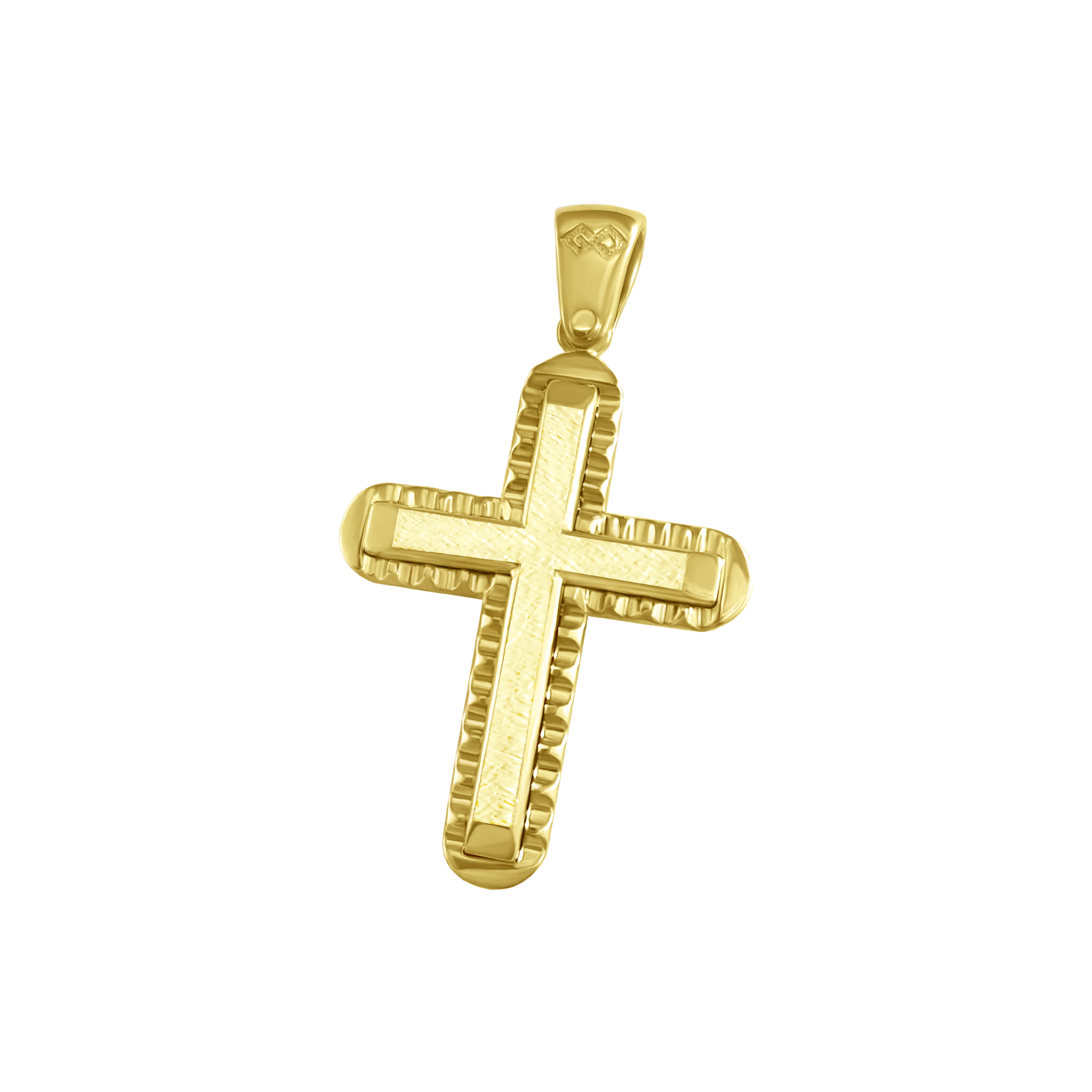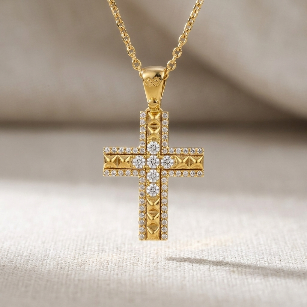 Αυτός ο σταυρός αποτελεί την επιτομή της λάμψης, διαθέτοντας έναν κεντρικό κορμό με ανάγλυφα γεωμετρικά μοτίβα (πυραμίδες), ο οποίος πλαισιώνεται από δύο σειρές λαμπερών ζιργκόν. Η αντίθεση ανάμεσα στον ανακλαστικό χρυσό και τη συνεχή λάμψη των ζιργκόν δημιουργεί ένα κόσμημα που μαγνητίζει το βλέμμα, ιδανικό για όσους επιθυμούν μια πολυτελή και μοντέρνα εμφάνιση.