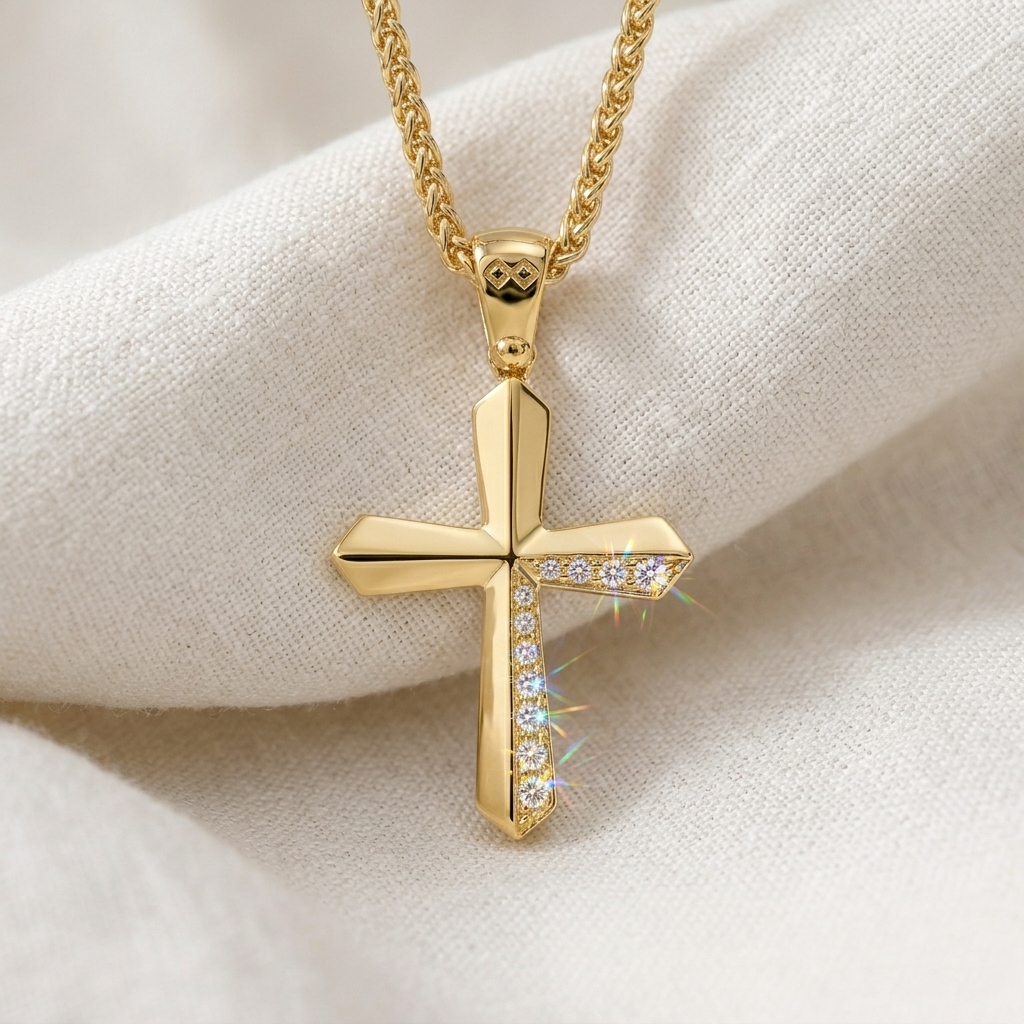 την κλασική φόρμα του σταυρού. Ο κωδικός ST-060 ξεχωρίζει για τις έντονες, γωνιώδεις γραμμές του και τον ασύμμετρο στολισμό με λίθους, οι οποίοι αγκαλιάζουν τη μία πλευρά του κάθετου και οριζόντιου άξονα.